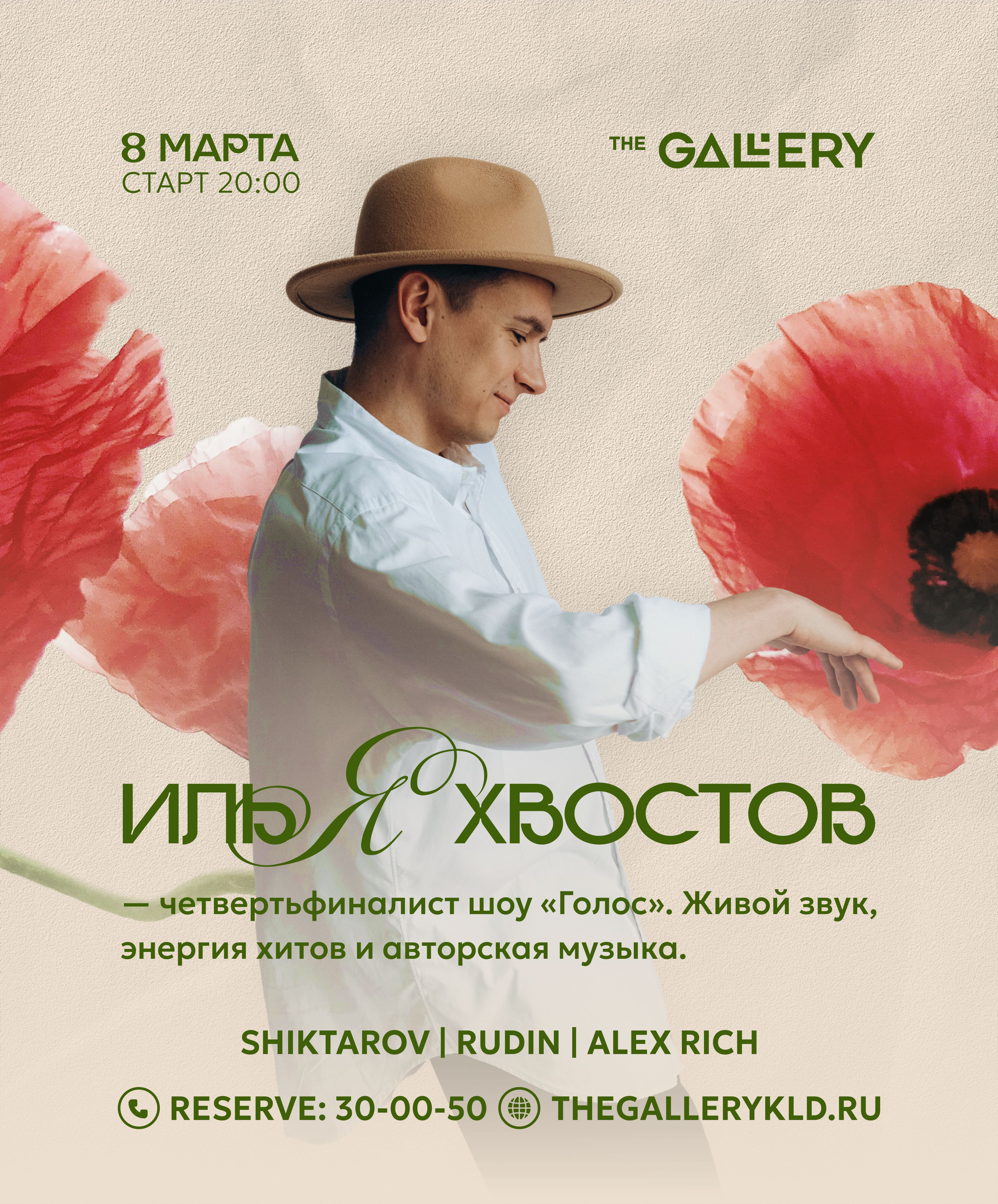 По случаю самого женского праздника «Галерея» представляет выступление артиста, чье имя уже стало легендой в нашем прекрасном городе. Илья Хвостов — финалист проекта «Голос», чье исполнительское мастерство и невероятная энергетика покорили сердца миллионов!